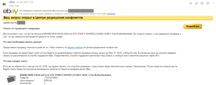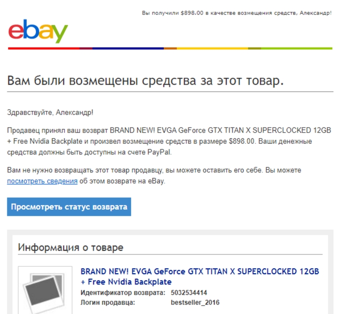 В общем, в далеком 2016 году в решил сделать свой первый заказ на Ebay, хотел видеокарту Nvidia GTX Titan X. Поискал предложения, нашел продавца с каким-то количеством положительных отзывов и сделал заказ, по цене была $799 на тот момент, а с учетом доставки вышло $898. В общем, спустя некоторое время посылка была отправлена и за доставку по нашей необъятной взялась служба СПСР (красавчики, прям чмоке в обе щёки за оперативность!).