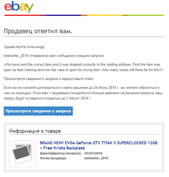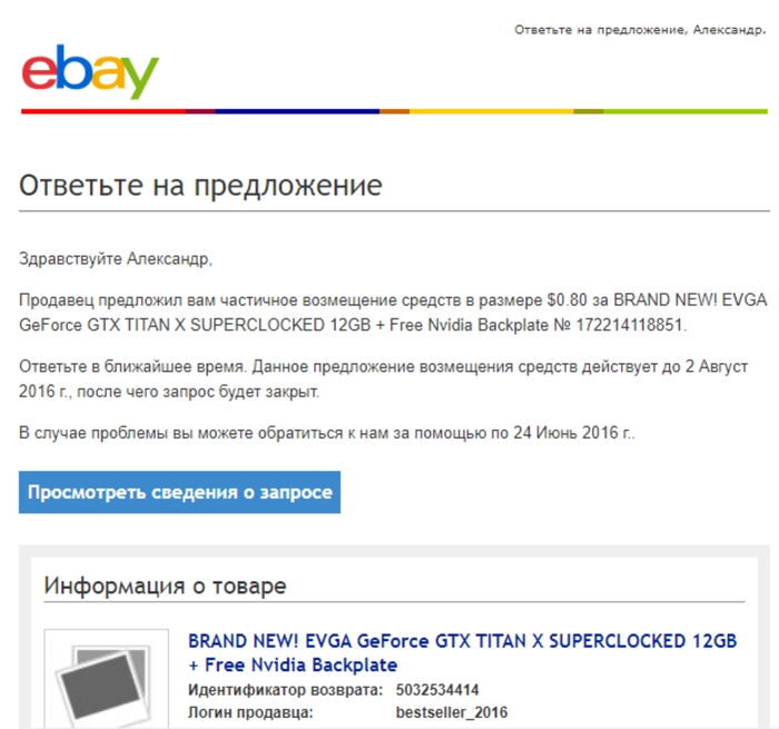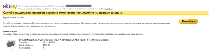 А вот и нет! Нихрена! Сам дебил - оформил диспут наскоряк и указал, что товар не был доставлен, хотя надо было выбирать какой-то другой пункт (не помню какой, в ЛК ебая сейчас нет истории за те древние года, чтобы глянуть что конкретно было и как, восстанавливаю память исключительно с помощью писем на мейле).
