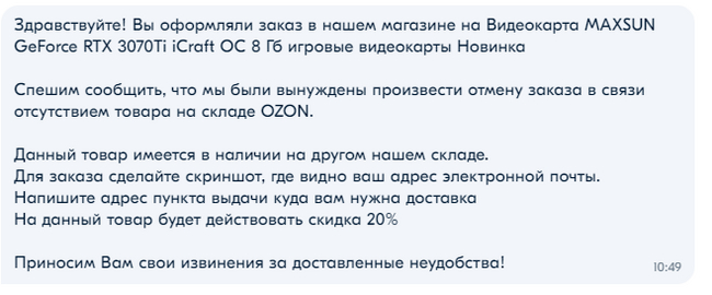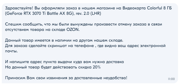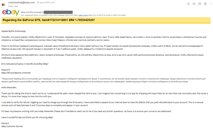 Помимо возврата цены видеокарты в $799, мне также возместили стоимость доставки и прислали отдельное письмо на эту тему с машинным переводом на русский :)