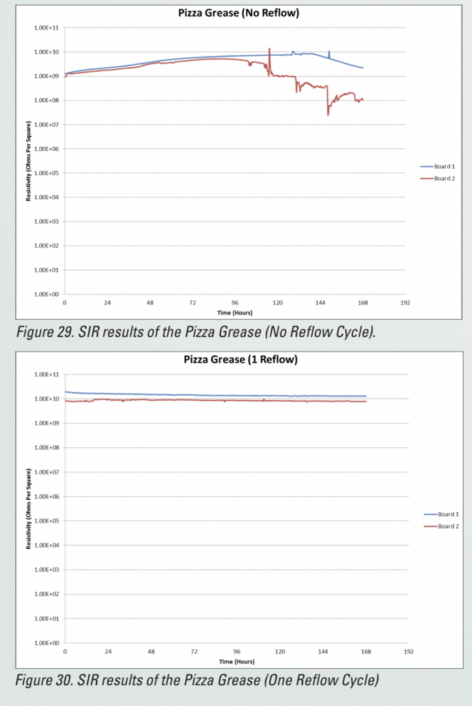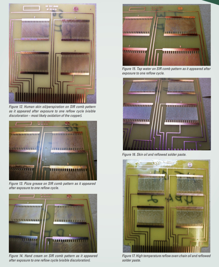 Водопроводная вода, кожное сало, крем для рук и жир от пиццы — инженер Indium Corporation измерил, как каждый из этих загрязнителей снижает поверхностное сопротивление изоляции электроники.
