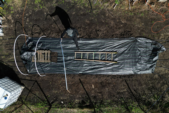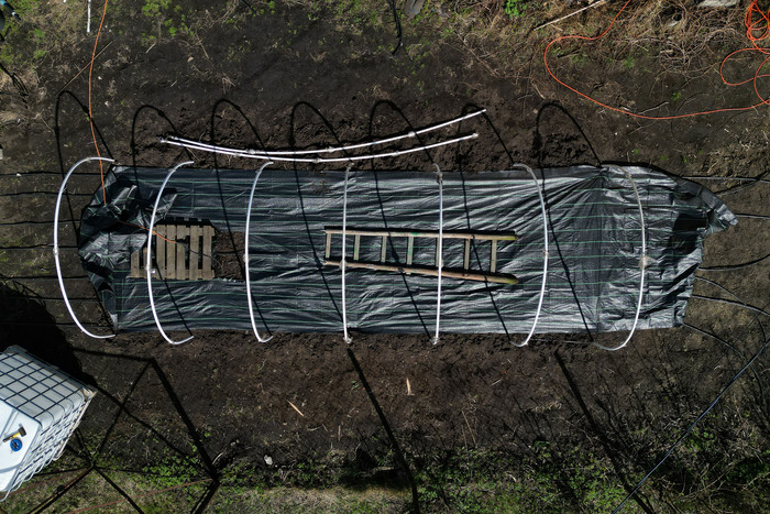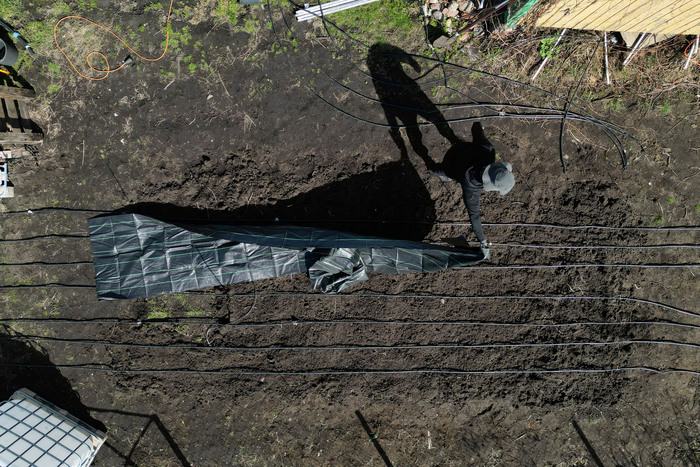 Как хорошо, что я не стал выкапывать греющий кабель с прошлого года, а значит, мне только нужно было внести удобрения, перекопать всё, уложить капельную ленту, затем накрыть агроволокном и построить временный парник. А, ну и высадить сами тыквы.