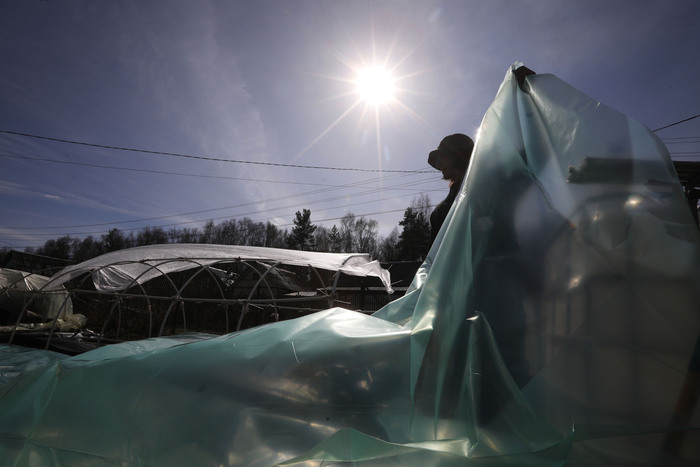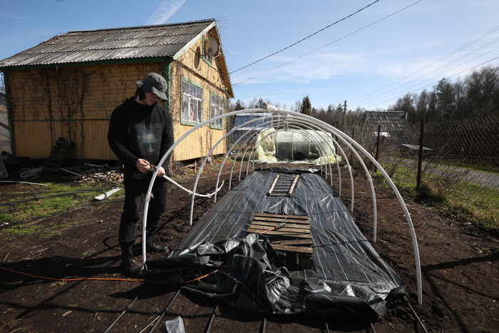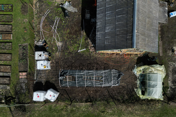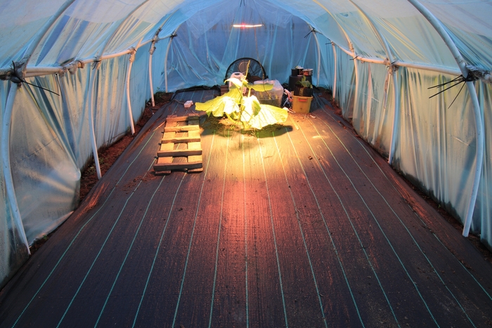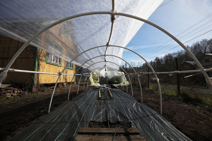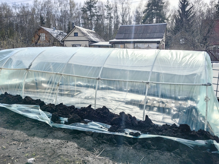 Эти нелепые парники я делаю каждый год. Снова и снова, ничего не меняя. Зато быстро и просто — о чём ещё мечтать? Внутри — обогрев грунта, воздуха, и если надо, можно ещё лампы повесить. Тыквы будут довольны.