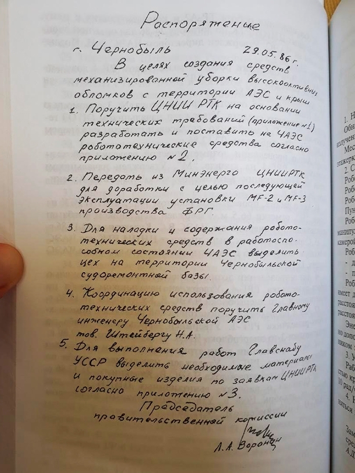 И на последок упомяну о самом первом безымянном роботе, собранном в начале мая из управляемой по кабелю детской игрушки-танка (по другим данным это был планетоход). К нему кустарно присобачили датчики, фонарик и камеру, короткий кабель управления заменили на 15-метровый. Да, это было немного, но на безрыбье и рак за щуку сойдёт. На удивление, проработал до 1987-го и был захоронен в глубинах реактора, т.к. сам уже фонил от души.