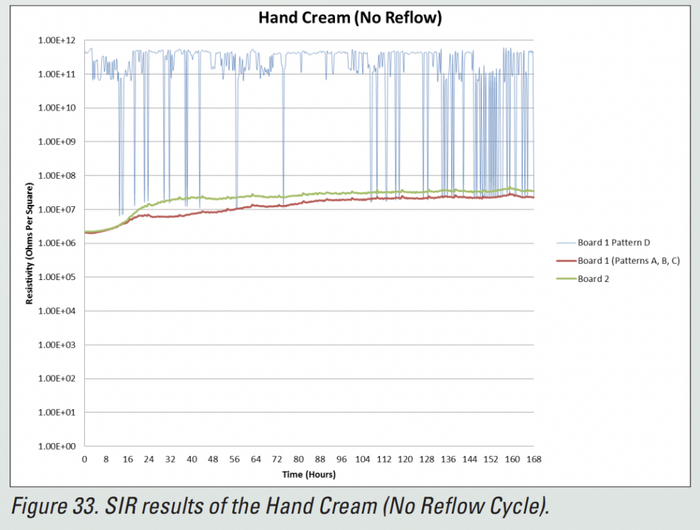 При нагреве компоненты крема испаряются или разлагаются. Но если крем попадает на плату после пайки — на этапе контроля, ремонта, упаковки — это самый разрушительный из протестированных загрязнителей.