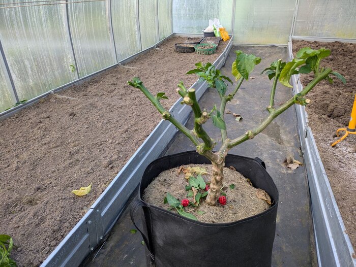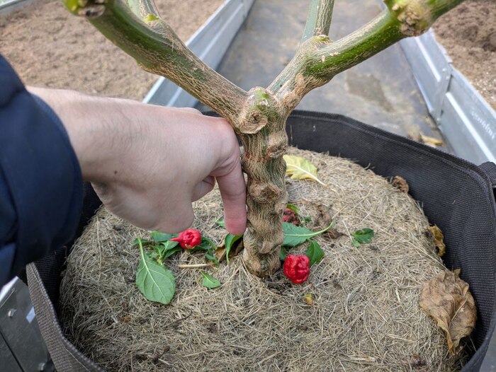В конце концов получаем такое вот бревно, которое еще пару дней постоит для адаптации, а потом я вытряхну землю, обрежу ему еще и корни и верну в тот эир пот, в котором он в мае приехал на дачу. Конечно вероятность того, что он сдохнет в процессе крайне велика. Ну а с другой стороны, почему бы и нет? Опыт зимовки годовалых перцев у меня имеется, главное, чтоб он смог одуплиться после такого гиганьского стресса.