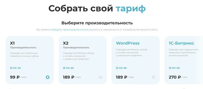 Тарифы хостинга Jino построены на гибкой системе с конструктором тарифного плана. Вы можете самостоятельно выбрать нужную производительность в зависимости от задач вашего сайта — от небольших личных проектов до крупных корпоративных решений.