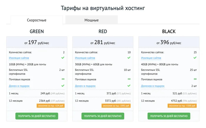 • Базовый — 189 руб. /мес. с 15 ГБ SSD, 2 сайта, 5 почтовых ящиков, 3 ГБ SSD для баз данных, нагрузкой 7% на ядро, доменом RU/РФ в подарок и бесплатным HTTPS/SSL