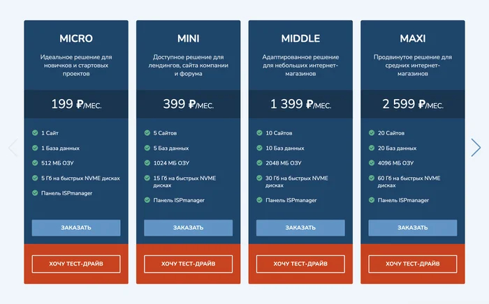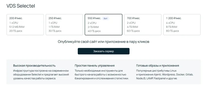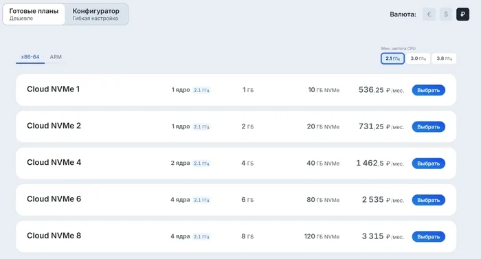 • Стандарт — 1265 руб. в месяц с 80 ГБ NVMe SSD, 2 CPU, 4 ГБ RAM и остальными возможностями как в Мини; Комфорт — 1695 руб. в месяц с 120 ГБ NVMe SSD, 4 CPU, 8 ГБ RAM