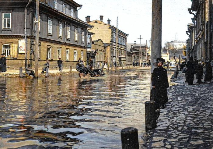 «Набережные — сплошное море. Из воды торчали только фонарные столбы, ломались перила, а по течению неслись брёвна, стога сена, дрова, обломки изб. У мостов возникли импровизированные «извозчичьи биржи» — ломовики перевозили пассажиров через затопленные кварталы. В лодках рисковали ходить редкие смельчаки: течение могло унести их в миг... А отрезанные от суши жильцы махали родным носовыми платками из окон».
