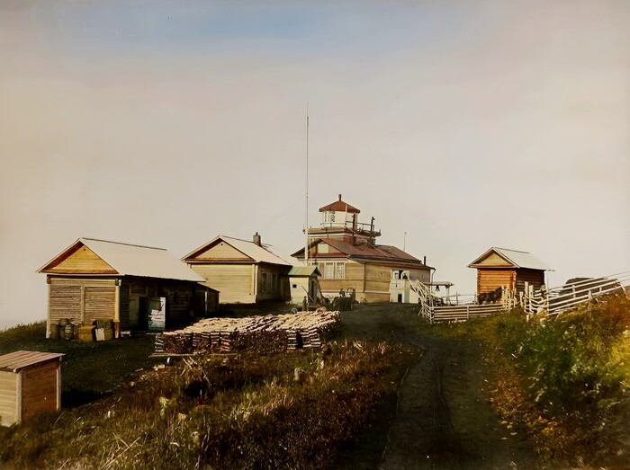 Этот маяк построен в 1886 году - шестиугольная деревянная маячная башня с восьмигранным фонарем была совмещена со зданием - помещением смотрителя маяка. Для служителей были построены казарма, баня, сарай для припасов и инвентаря. Здание и постройки были окрашены в желтый цвет. К маяку была проложена дорога в "десять зигзагов" от прорубленного ранее тоннеля в скале мыса.