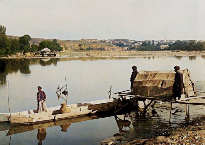 Берега реки Куры и вывоз бревен на буйволах, 1900 год.
