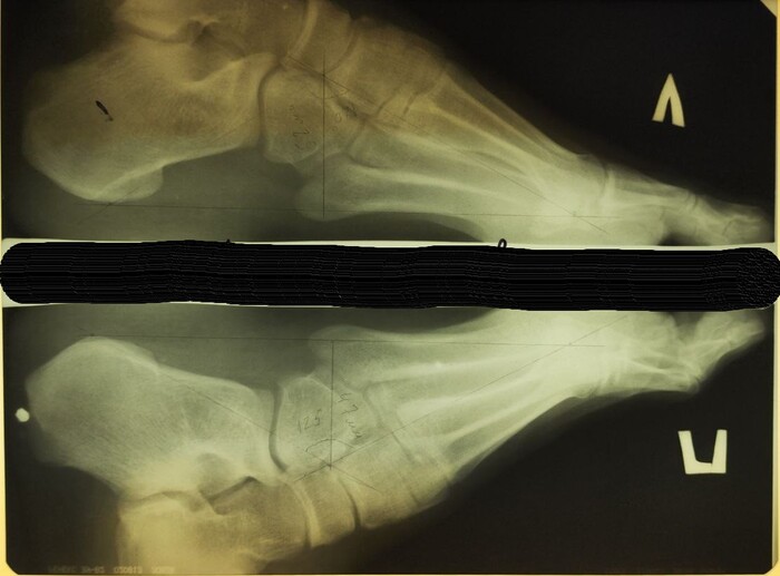 На рентгенограмме костей таза: суставные щели тазобедренных суставов неравномерно сужены, с выраженными краевыми остеофитами в верхне-наружном отделе. Субхондральный склероз суставных поверхностей. Головки бедренных костей уплощены, скошены, структура костной ткани с участками просветления чередующихся с участками остеосклероза. Шейки бедренных костей расширены. Заключение: Двусторонний коксартроз 3 ст. Асептический некроз головок бедренных костей.