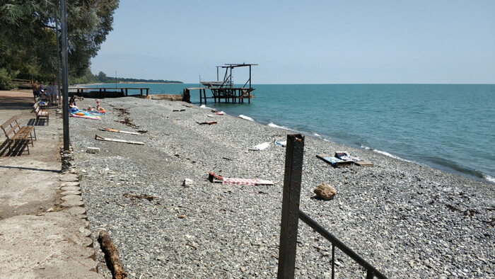 Пляж отдельный, огороженный с двух сторон. Но на нем тоже куча мусора, бревен. и странных лежаков.