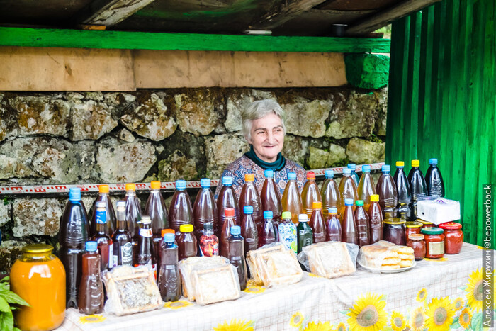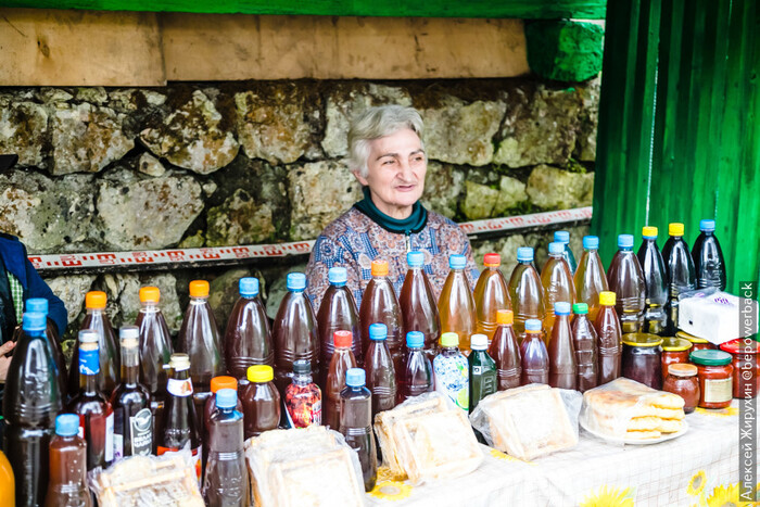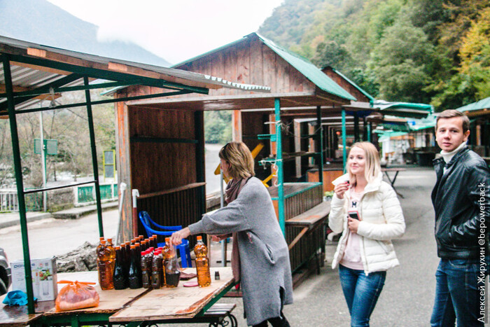 Около озера, как и у любой достопримечательности Абхазии, стоит рынок с местными лакомствами: вином, медом. Если ехать с джип-туром, то водитель обычно говорит, что привезет в то место, где продается лучшее вино и мед, и привозит каждый к своему другу и родственнику. Я бы посоветовал вообще ничего не покупать тут. Одна девушка, купившая миндаль, в отеле обнаружила, что это косточки абрикоса.