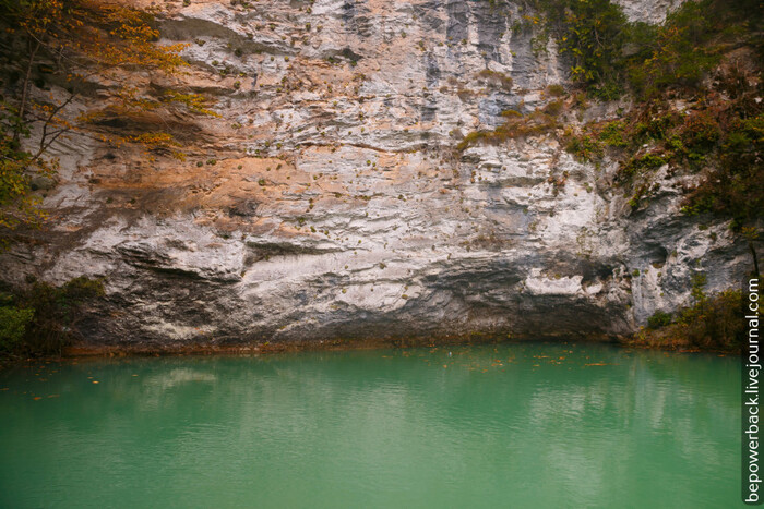 Остановка, которую делают по экскурсионному маршруту на Рицу - Голубое озеро. Круглогодично цвет у озера один. Цвет у него не меняется даже в самую пасмурную погоду. По площади озеро не очень большое (180 кв. м.), за то в глубину достигает 76 метров. Здесь экскурсовод обычно рассказывает легенду про старца. В сезон тут еще стоят абхазы с павлинами, медведем и другими животными, чтобы сделать фотографии. Сейчас тут пусто и это очень радует. Сделали быстро фотографии и поехали дальше.