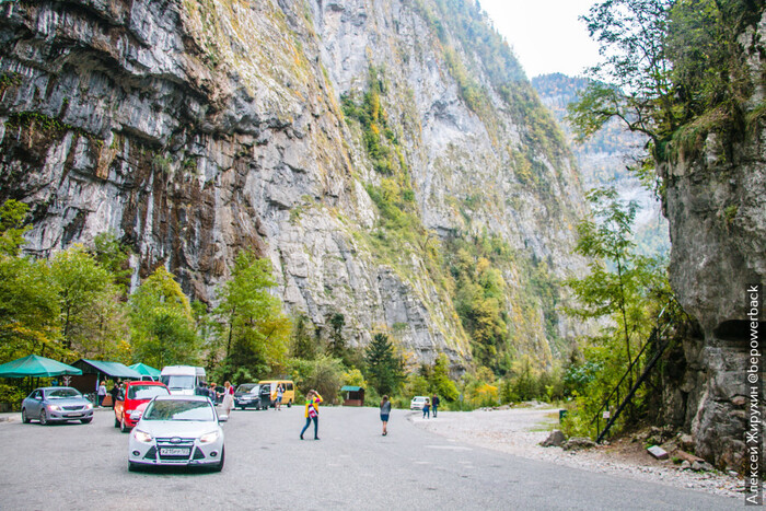 Далее дорога ведет через Юпшарскому каньону, второе название которого – «Каменный мешок». «Каменным мешком» его прозвали неспроста. Каньон, образованный в результате раскола горы, имеет протяженность 8 км, высота скал составляет около 400 метров, и при этом расстояние между верхушками скал не превышает несколько десятков метров.