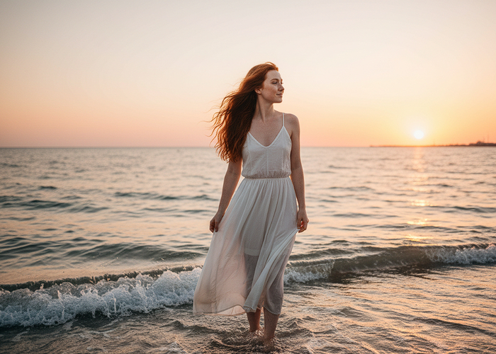 Портрет девушки 25 лет в белом летнем платье, стоит на берегу моря босиком в воде по щиколотку, смотрит на закат, волосы развеваются на ветру, золотой час (мягкий тёплый свет с оранжевым оттенком), романтическое настроение, профессиональная фотосессия в стиле lifestyle, формат 3:4, высокая детализация. Не меняй черты лица и пропорции фигуры.