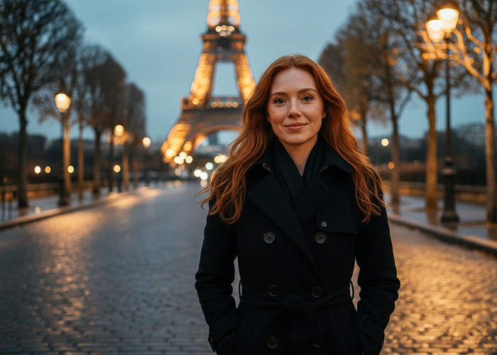 Перенеси эту девушку на улицу Парижа, Эйфелева башня видна на заднем плане на расстоянии 200 метров, вечер, мягкий свет уличных фонарей, брусчатка под ногами. Сохрани одежду, лицо и позу.