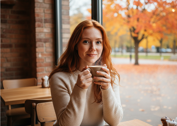Девушка с медно-рыжими волосами до плеч сидит в кафе за столиком у окна. Волосы блестят на свету, естественный оттенок. Не меняй лицо, одежду и фон.