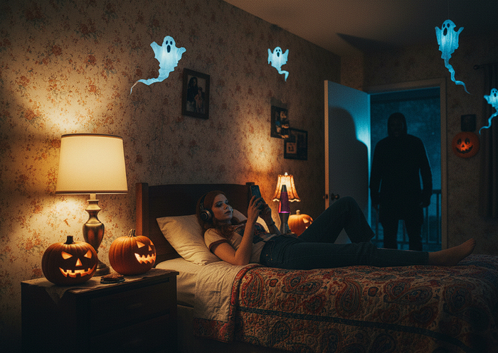 "Драматическое вечернее освещение: единственный источник света — настольная лампа, создающая глубокие тени"