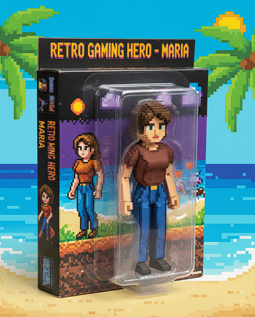 Преобразуй фотографию в коллекционную фигурку в винтажном стиле игрушек 80-х годов. Сохрани узнаваемость персонажа, добавь характерные для того времени детали: яркие неоновые цвета на упаковке ([розовый, жёлтый, синий]), ретро-шрифты, звезды и молнии. Упакуй фигурку в коробку с ярким дизайном эпохи 80-х, с надписью "ACTION HERO" и именем персонажа "[Имя]". Блистерная упаковка с картонной подложкой.
