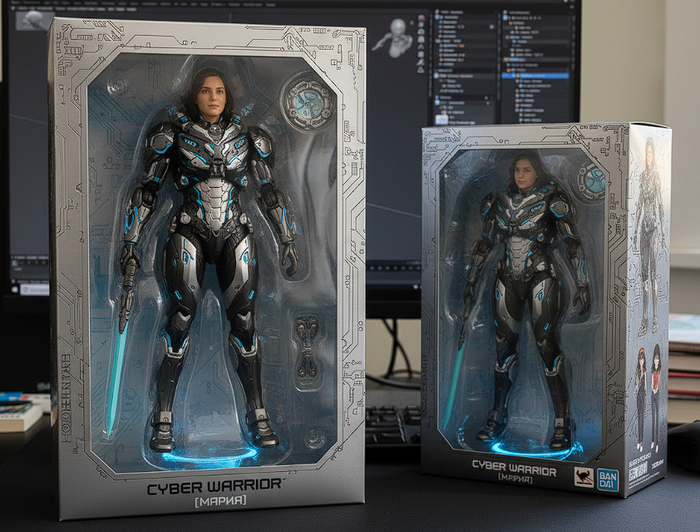 Трансформируйте персонажа в научно-фантастическую экшн-фигурку в футуристической броне. Добавьте технологичные элементы: светящиеся [синие] детали, механические части, футуристическое оружие [энергетический меч]. Упаковка в стиле sci-fi: металлический серебристый фон, голографические элементы, техно-шрифт. На коробке надпись "CYBER WARRIOR SERIES" и имя персонажа "[Имя]". Фигурка на подставке с эффектом левитации.