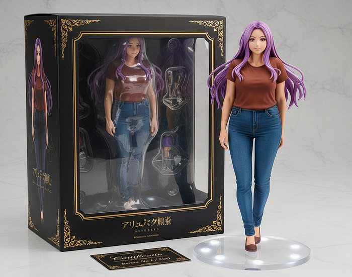 Создайте премиальную аниме-фигурку персонажа в масштабе 1/7. Стилизация в японском аниме-стиле с большими выразительными глазами, яркими цветами волос [цвет волос]. Фигурка на прозрачной подставке с LED-подсветкой. Упаковка в стиле японских производителей фигурок: чёрная коробка с золотыми акцентами, прозрачное окно спереди, логотип серии. Рядом сертификат подлинности и номер в серии (1/500). Детализация максимальная: складки одежды, пряди волос, текстуры.