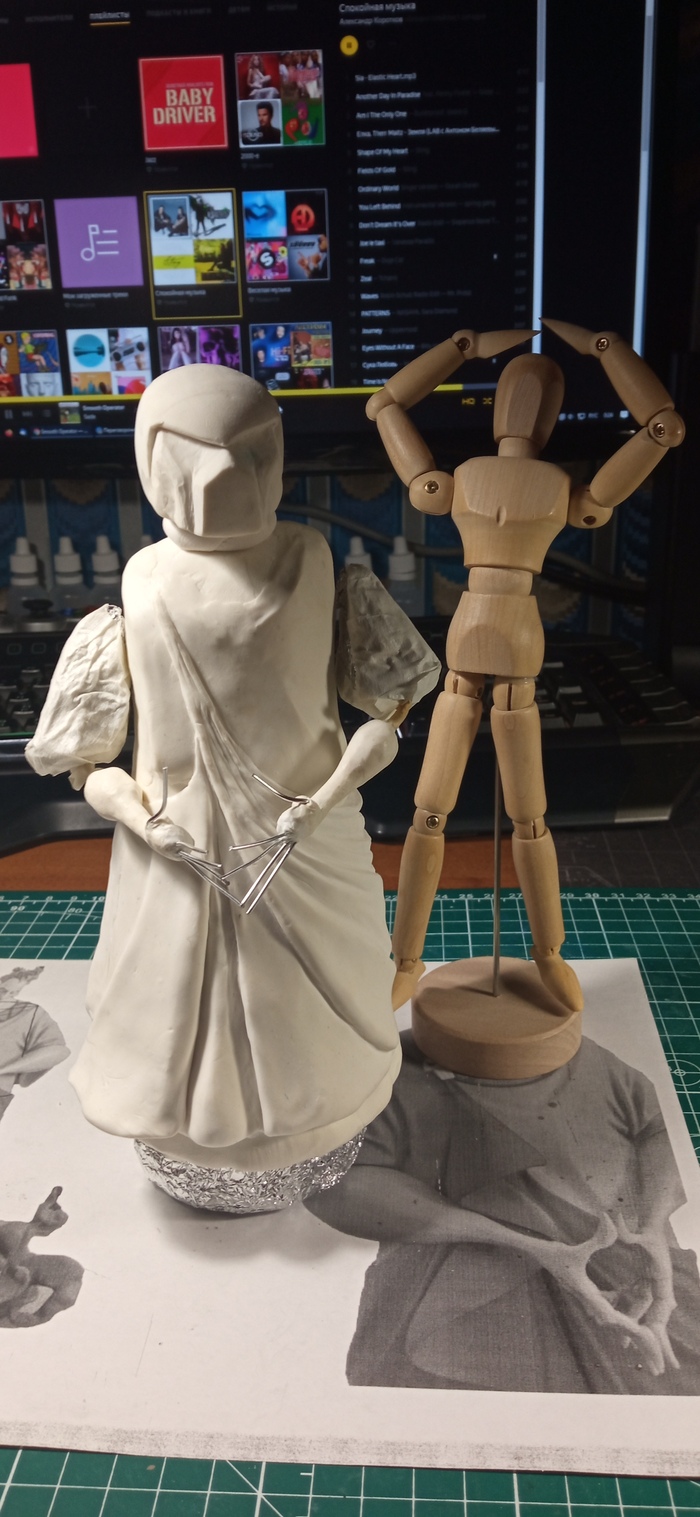 Далее продолжаем создавать каркас. Делаю его из проволоки, объем набираю с помощью фольги. Чтобы это все держалось, желательно обмотать это малярным скотчем, на нем пластилин неплохо держится.