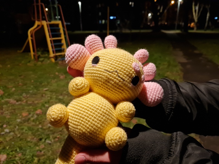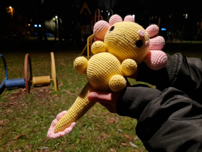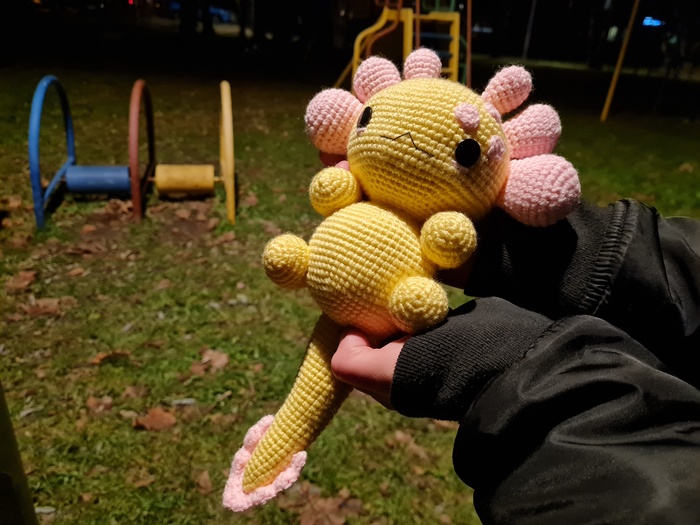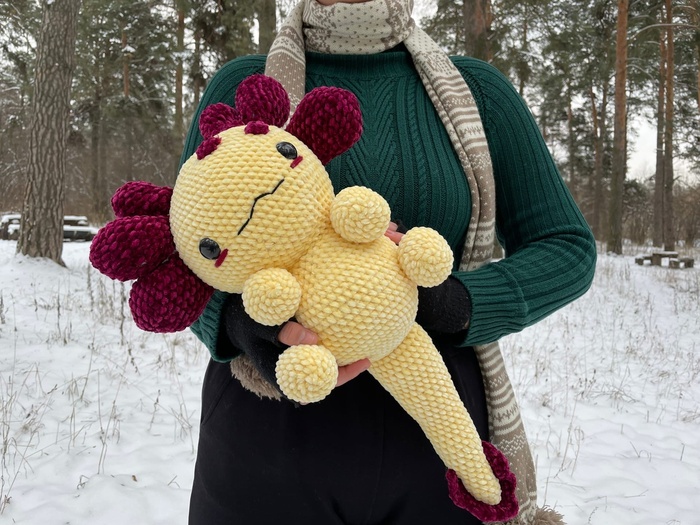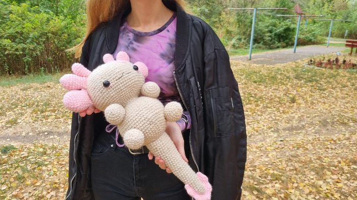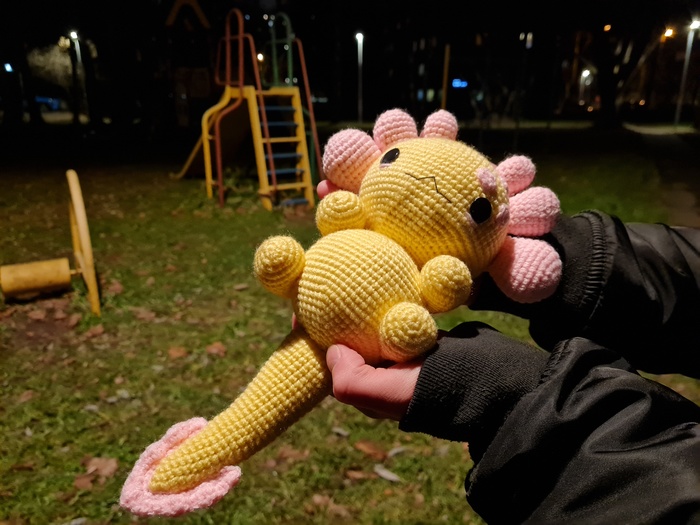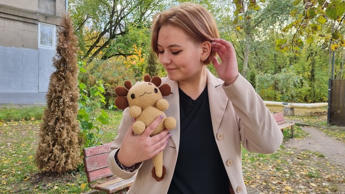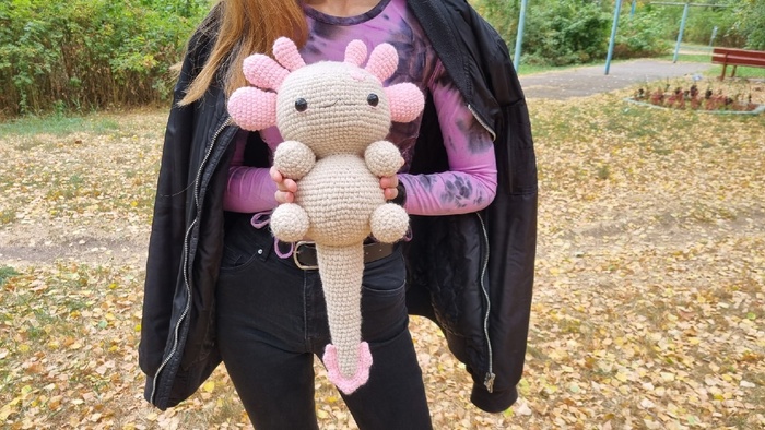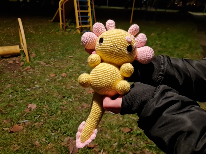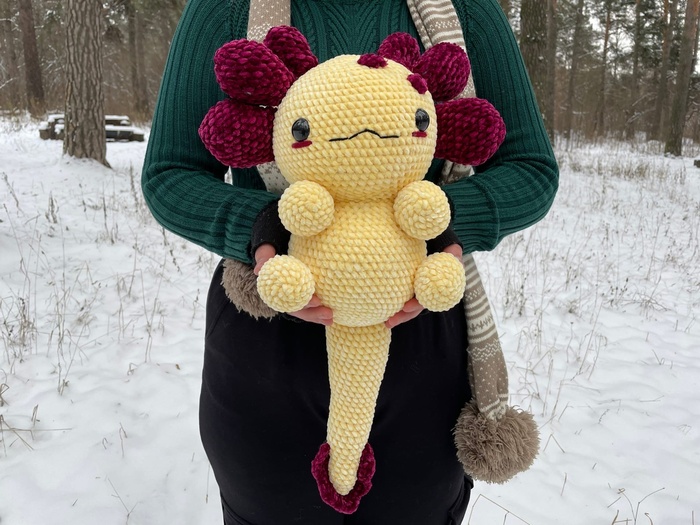 Я впервые изготавливала игрушку из подобных материалов, это был очень необычный для меня опыт, я бы с удовольствием связала еще одного Плюшевого Аксолотля. Он получился очень милым и мягким, поэтому его постоянно хочется затискать, что, собственно, и делали все, кто его успел увидеть. Я еле сдержалась, чтобы в первый же день не лечь с ним спать в обнимку.