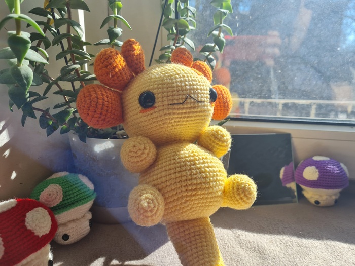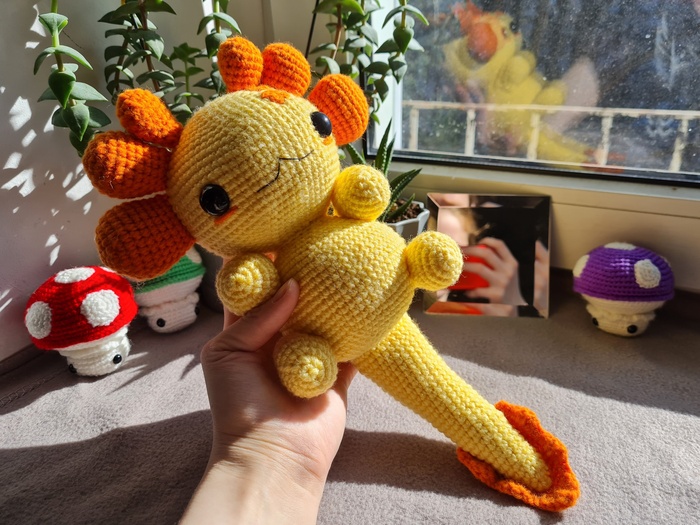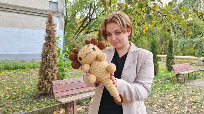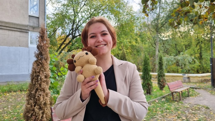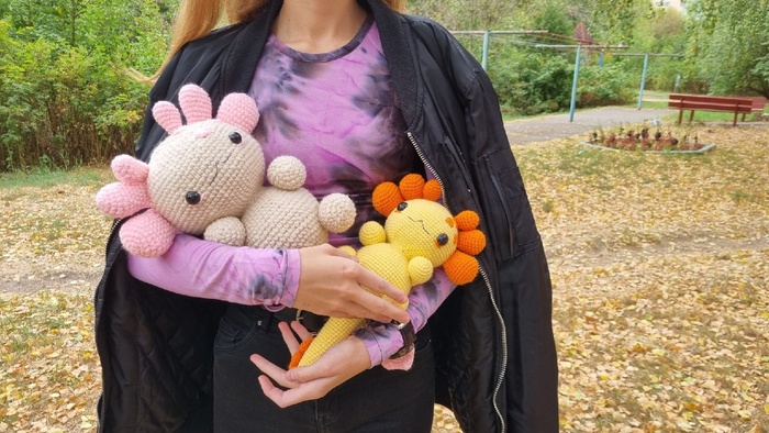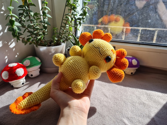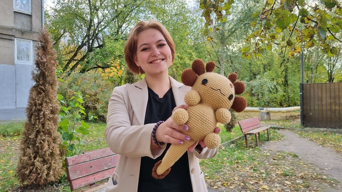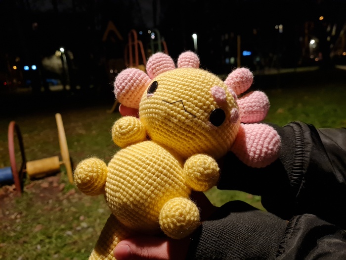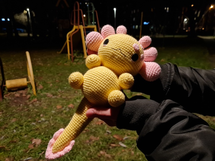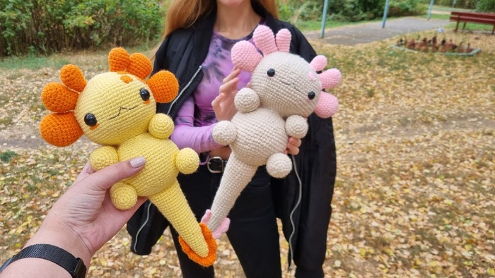 Я впервые изготавливала игрушку из подобных материалов, это был очень необычный для меня опыт, я бы с удовольствием связала еще одного Плюшевого Аксолотля. Он получился очень милым и мягким, поэтому его постоянно хочется затискать, что, собственно, и делали все, кто его успел увидеть. Я еле сдержалась, чтобы в первый же день не лечь с ним спать в обнимку.