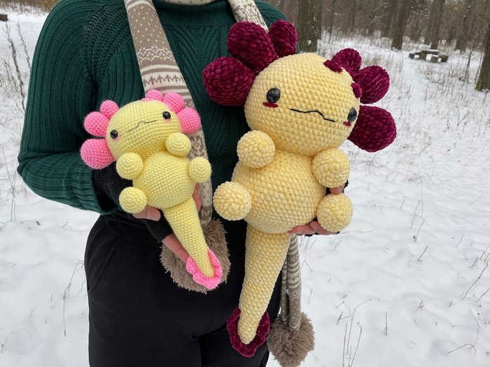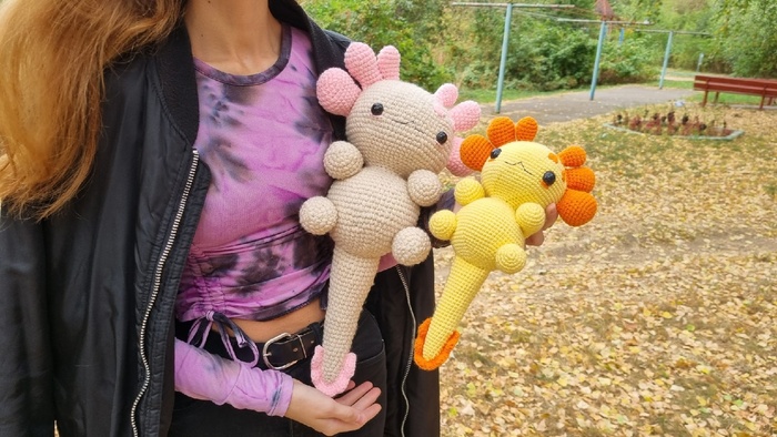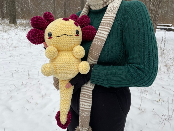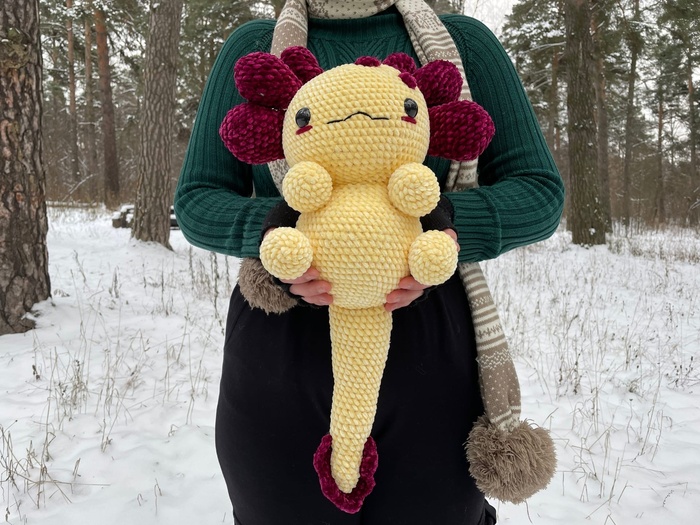 У нас есть целый альбом с фотографиями связанных Вами Аксолотлей, и однажды мы там подглядели очень прикольных плюшевых Аксолотлей, поэтому мы не смогли удержаться и решили тоже создать "плюшевого хищника" XXXL размера.