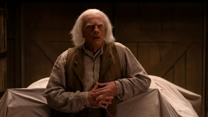 Так вот, в одной из сцен главный герой заходит в кузницу, и обнаруживает доктора Брауна, который "колдует" над машиной времени. Роль дока здесь также исполнил уже постаревший Кристофер Ллойд.