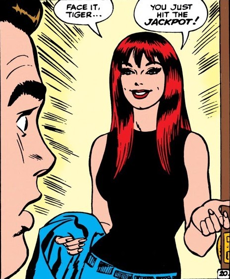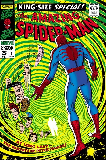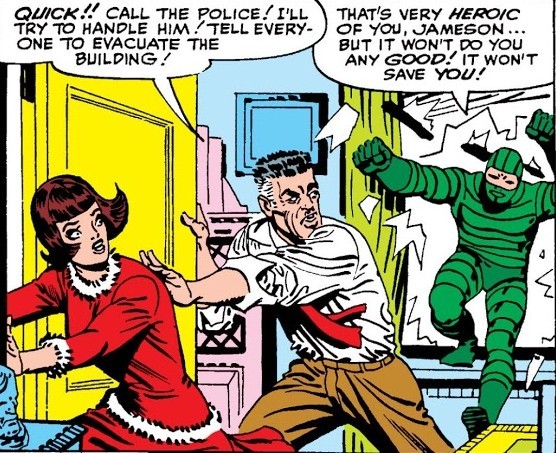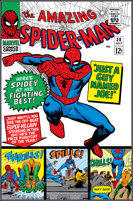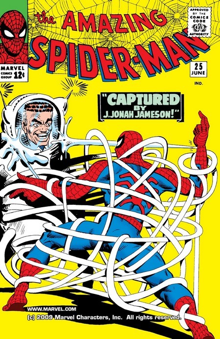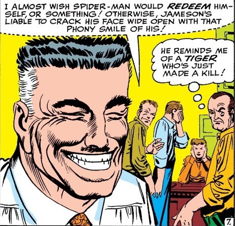 И вот ТЕПЕРЬ можно перейти к комиксу The Amazing Spider-Man #1 за март 1963 года. Опять же, от Стэна Ли и Стива Дитко. Дела у Питера Паркера и его тёти Мэй плохи – погиб главный кормилец, дядя Бен, и деньги кончаются. Нужно подзаработать – но карьера в шоу-бизнесе не задалась, чеки за выступления не получается обналичить (они выписаны на имя Человека-Паука и банк отказывается обналичивать чек без предъявления паспорта или водительского удостоверения на имя Человека-Паука), да и злющий главред Дэйли Бьюгл, Дж. Джона Джеймсон, разгромные статьи печатает. Из этих же статей Питер узнаёт о сыне Джеймсона, астронавте Джоне Джеймсоне – и отправляется на космодром, чтобы стать свидетелем его приземления. Но что-то идёт не так и капсула Джона сбивается с курса. Переодевшись, Человек-Паук угоняет небольшой самолёт вместе с пилотом, с его помощью догоняет капсулу, высаживается на неё и меняет перегоревший модуль управления (он запаску с собой прихватил, когда угонял самолёт). И думает, типа это изменит мнение Джеймсона…ага, щаз! Выходит разгромная статья о том, что Человек-Паук саботировал приземление капсулы, чтобы потом демонстративно спасти Джона. Так начинается вражда Паука и Джеймсона…