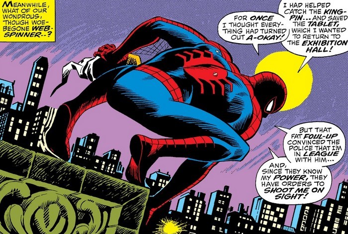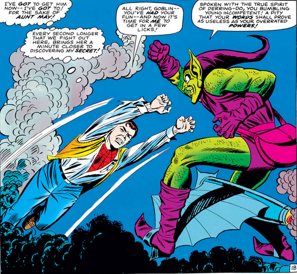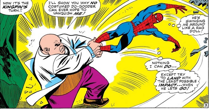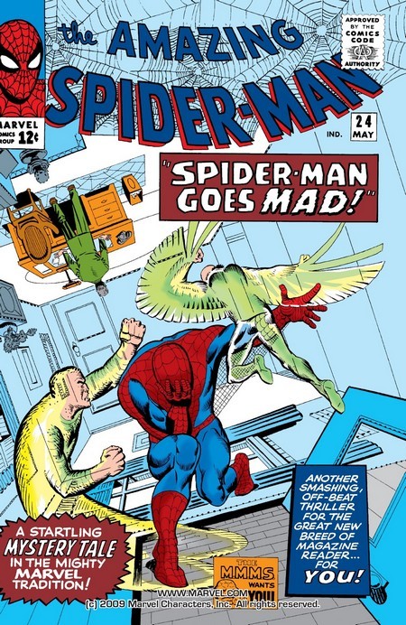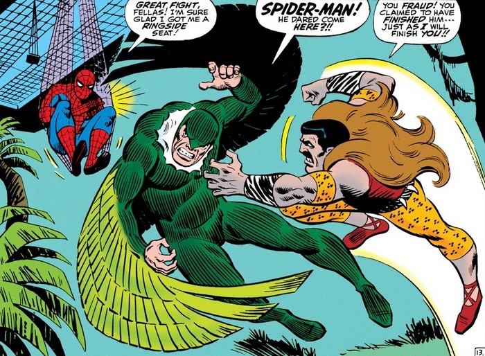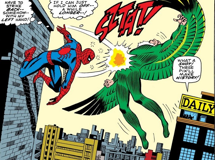 А дело переходит к комиксу The Amazing Spider-Man #2, и в Нью-Йорке появляется новый ужасающий преступник – Стервятник. На искусственных крыльях он спускается с небес, крадёт ценности – и улетает, и никому не удавалось его сфотографировать, а ведь Джеймсону нужны фотографии. Чем не идея для стартапа? Питер решает найти и сфотографировать Стервятника, а фотки продать Джеймсону. Всё ж хлеб. При первой встрече Питеру удаётся сфотографировать Стервятника – но не удаётся победить, потому что хитрый старик (да, Стервятник немолод) забрасывает Паучка в водонапорную башню. Впрочем, выбравшись, вернувшись домой, обсохнув и проявив фотки (напомню, это 1960-е годы, нельзя просто щёлкнуть телефоном и за секунду выложить в интернет и бешено растиражировать по всем сайтам, проявление плёнки – долгий и муторный процесс), Питер сооружает антимагнитный инвертер, который при следующей встрече вырубает крылья Стервятника. Человек-Паук сдаёт Стервятника полиции, а Питер Паркер продаёт фотографии Джеймсону и получает внушительную денежную награду – теперь можно и за аренду квартиры заплатить, и поесть купить!