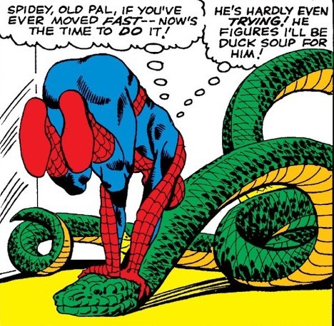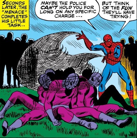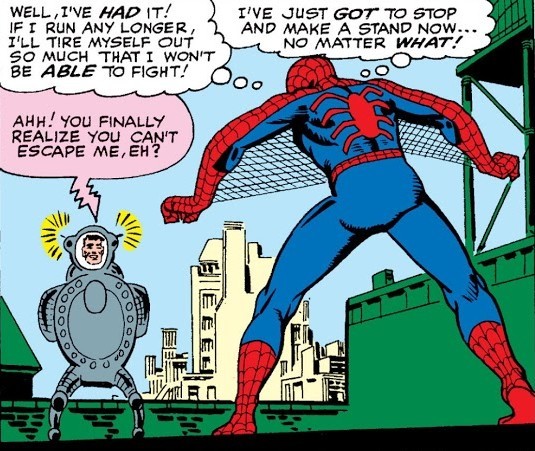 Разумеется, за дело берётся Человек-Паук…и ж0ско проигрывает в битве с Осьминогом и впадает в депрессию. Но это даёт заложникам возможность сбежать. Доктор Осьминог после этого захватывает лабораторию с мощнейшим источником атомной энергии, и правительство просит о помощи Фантастическую Четвёрку – но герои слишком заняты, у них дел невпроворот. Впрочем, Человек-Факел (Джонни Шторм) заглядывает в школу, где учится Питер Паркер, и толкает воодушевляющую речь. Включив после такого думалку, Питер сооружает особый приборчик, который при следующей встрече склеивает вместе две металлические тентакли. После этого остаётся заляпать очки Октопуса паутиной – и заванпанчить резко ставшего беспомощным учёного. И не забыть сделать фотографии с наиболее выгодных ракурсов. Питер и не подозревает, что с Осьминогом ему ещё не раз придётся столкнуться…