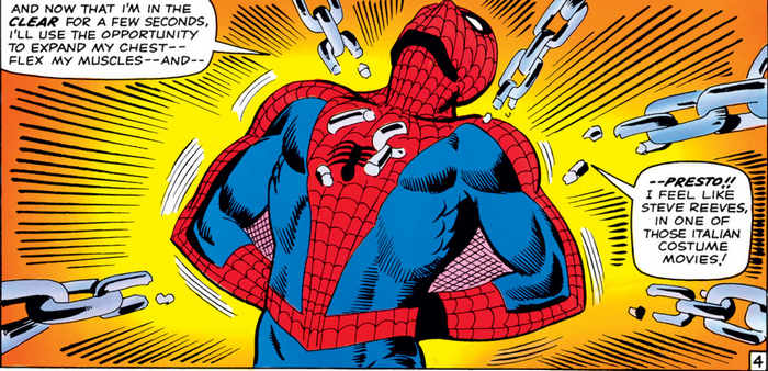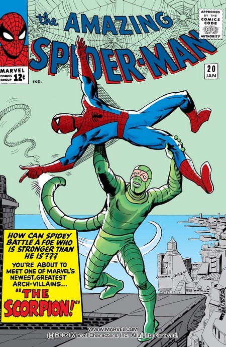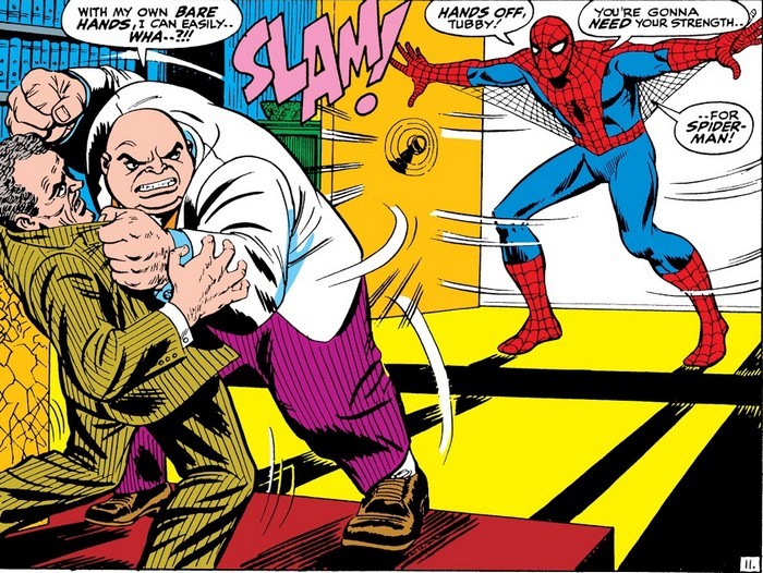 К расстройству перфекционистов, начнётся сегодняшний пост не с первого выпуска соответствующего тайтла, а с легендарочки – Amazing Fantasy #15, комикса, в котором дебютировал Человек-Паук, за август 1962 года. Запомните эту легендарную обложку – она встретится вам ещё не раз. Главную историю в номере расписывает и обрисовывает Стив Дитко – хотя и Стэн Ли к сценарию руку приложил в немалой степени. Итак – золотая классика. Скромный пятнадцатилетний «ботан» Питер Паркер, очень любящий учиться, посещает научную выставку, посвящённую радиации. На выставке, где меры безопасности аж никакие, одинокий паук проползает через «радиационный луч», заражается радиацией, кусает Питера – и практически сразу подыхает. Питеру и самому становится плохенько и он идёт домой – но по пути его чуть не сбивает машина, и Питер, спасая свою жизнь, запрыгивает на стену дома и прилипает к ней. Во дела! Взобравшись по стене на крышу и случайно помяв голой рукой стальную трубу, Питер понимает, что разжился пропорциональной силой и ловкостью паука – и сразу решает попробовать заработать деньжат в реслинге. Потому что скромный «ботан» в первую очередь пойдёт именно туда. Тем более, тому, кто продержится три минуты против Крушителя Хогана, дадут 100 долларов!