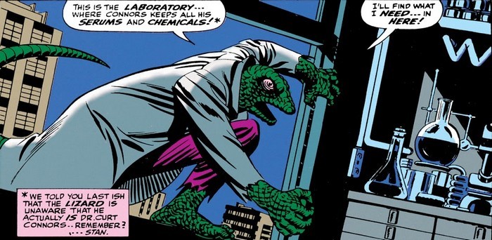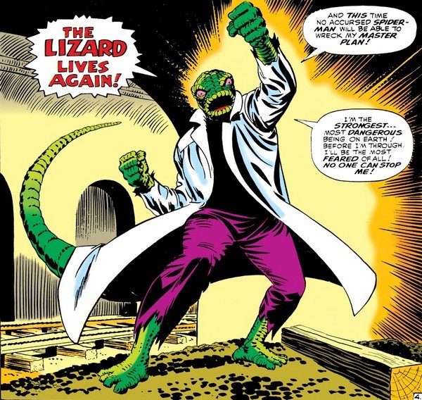 Дебют за дебютом почти в каждом номере! В комиксе The Amazing Spider-Man #6 за ноябрь 1963 года главред Дэйли Бьюгл, Джеймсон, выдвигает Человеку-Пауку челлендж: одолей Ящера, или зассал! Да, где-то во Флориде объявилось странное существо, гуманоидный ящер, которого все зовут просто Ящером. Джеймсон сам отправляется во Флориду, прихватив с собой Питера Паркера. Ничего не поделаешь, откажешь работодателю – останешься без денег. Во Флориде Питер отправляется типа купить плёнки для фотоаппарата – а сам переодевается в Человека-Паука и идёт в первую очередь к главному специалисту по рептилиям всея Флориды, доктору Кертису Коннорсу. Там-то его и ждёт сюрприз: жена Коннорса объясняет, что Курт Коннорс – и есть Ящер. Он создавал сыворотку, позволяющую отращивать утерянные конечности, и досоздавался до того, что превратился в рептилоида.