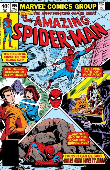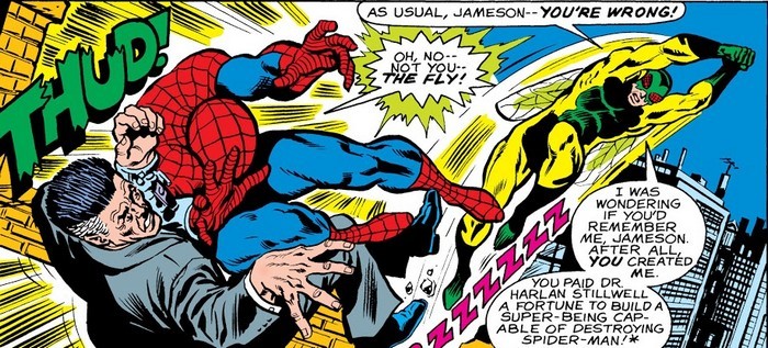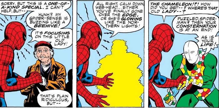 Ну или нет, ведь впереди комикс Amazing Spider-Man #158. Падает себе Человек-Паук с большой высоты – но в лепёшку не расшибается, потому что создаёт из паутины глайдер. Посадка всё равно жестковата, нужно костюм подлатать. Добирается Спайди в свою съёмную хату и начинает латать костюм – но вынужден постоянно отвлекаться, потому что от посетителей отбоя нет. То соседка, Глория Грант нагрянет, то Мэри Джейн в гости заглянуть решит. Питеру приходится тщательно прикидываться веником (Што, тётя Мэй пропала? А куда она делась? А почему мне не сказала? Ну надо же, а я и не знал. Ну, ты иди, а я потом как-нибудь её поищу). И ждёт Спайди, когда уже появится возможность продолжить поиск и отмаза, чтобы свалить – а тут как раз Джо Робертсон звонит, замглавреда Дэйли Бьюгл. «Питер, дуй в редакцию, дело есть». Отлично!