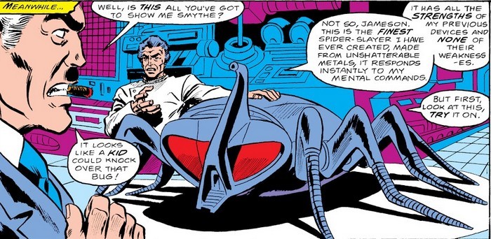 В общем, пообщавшись с тётушкой, Питер вновь выходит на улицы, как Человек-Паук – и на него вновь нападает дистанционно управляемый Паукомобиль! Скрутив Дружелюбного Соседа ремнями безопасности, шайтан-машинка отвозит его в гости к Жестянщику. Спайди в шоке – в прошлый раз он видел Жестянщика довольно давно, и тогда злодей оказался инопланетянином. Но сейчас он раскрывает, что облик инопланетного рептилоида был уловкой, которая позволила залечь на дно. «А сейчас мой робот и твой Спайдермобиль порвут тебя на кусочки!». Ну или не порвут, потому что Спайди даёт злой технике бой, Жестянщика обезвреживает, а от робота и Паукомобиля оставляет покорёженный металлолом. Обломки Спайдермобиля Человек-Паук вешает на паутинке под окнами компании, которая изначально ему эту идею задвинула, и оставляет послание – «Будь проклят тот день, когда я сел за баранку этого Паукососа, видал я в гробу ваши автомобили. Всего хорошего, Дружелюбный Сосед. P.S. Поторопитесь с вызовом эвакуатора, паутина продержится от силы два часа».