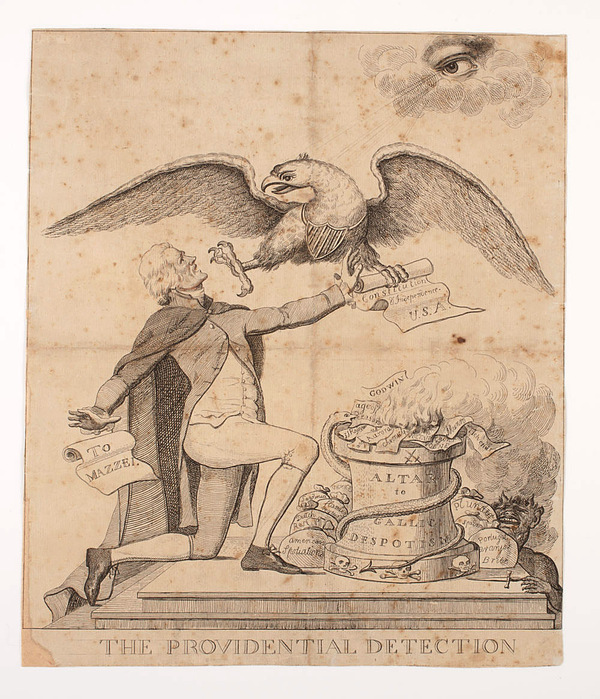 Мы подробно рассмотрели письмо Гамильтона, которое, вполне возможно, стоило победы Адамсу. Но не стоит думать, что Джефферсон не подвергался нападкам оппонентов. Одна из самых известных – карикатура The Providential Detection («Божественное обнаружение»). В ней показано, как Бог обличает вероломство Джефферсона, поклоняющегося безбожной французской революции и стремящегося сжечь американскую конституцию. В стране, где христианство было государственной религией, а многие избиратели лично помнили события войны за независимость и принятие конституции, это были весьма серьезные обвинения.