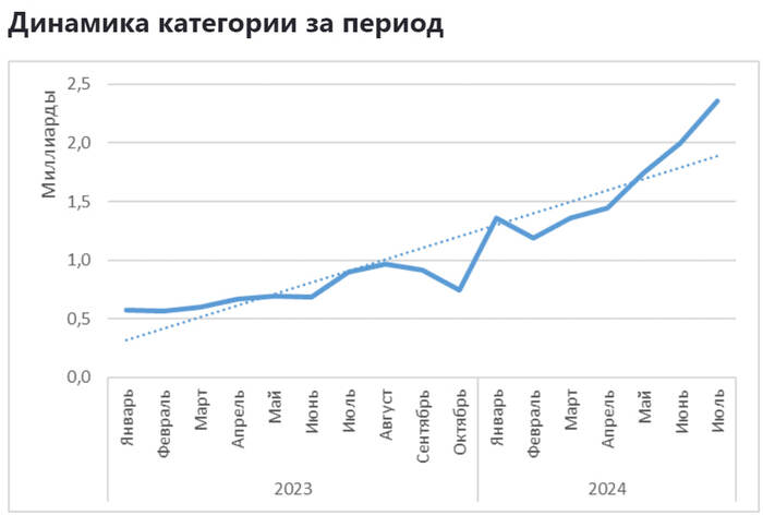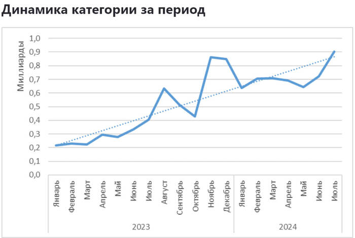 - Категория в 2024 году растёт на 100% по отношению к 2023 году (исключаем ноябрь из расчётов в связи со спецификой продаж в этом месяце).