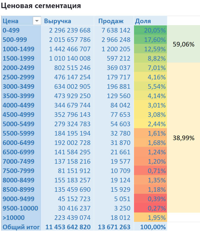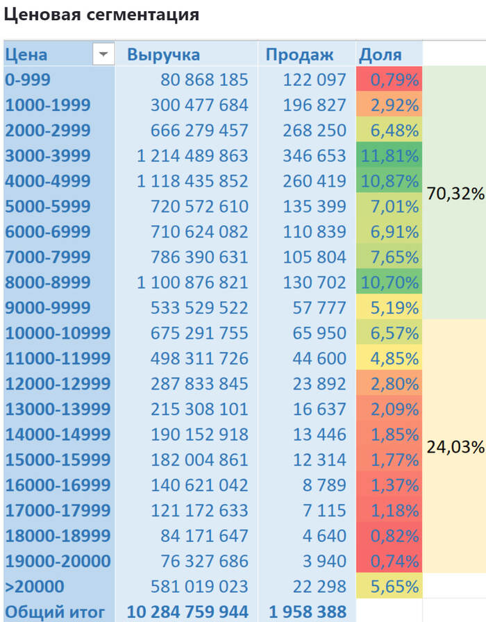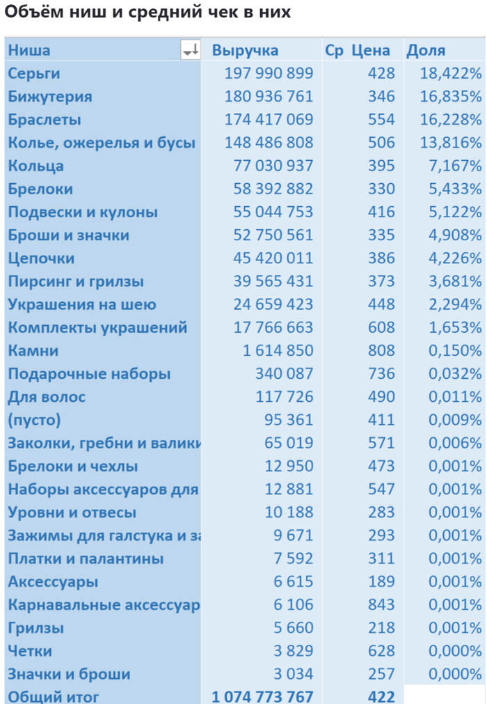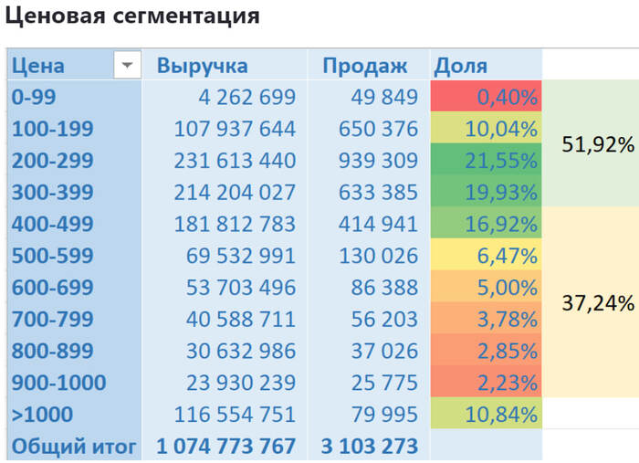 - 65% товаров в категории продаются дешевле 1000 руб. и 94% дешевле 3000 руб.