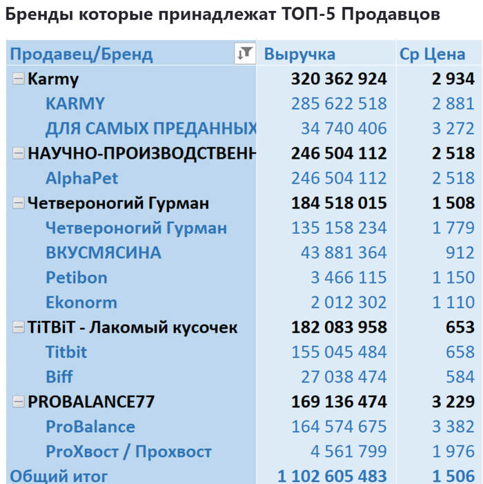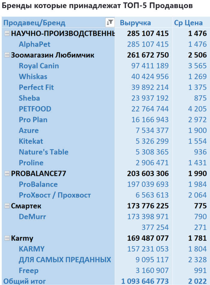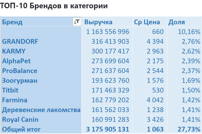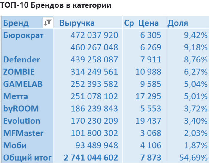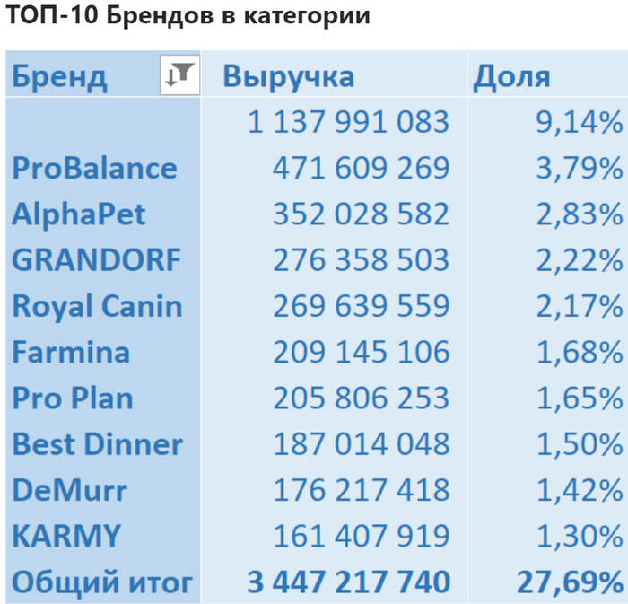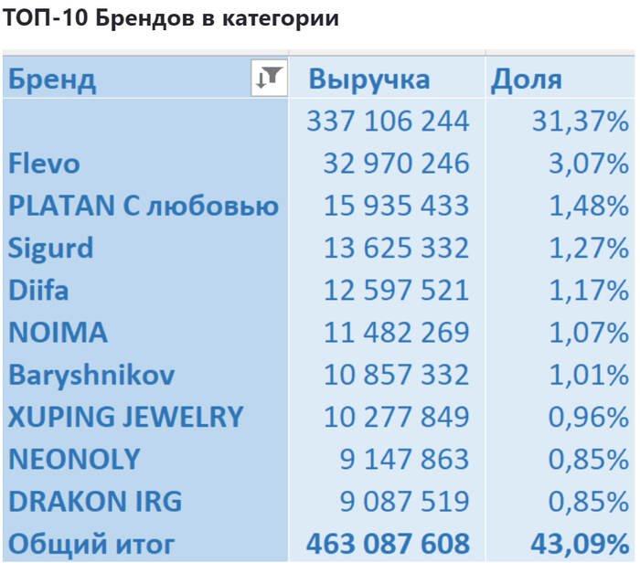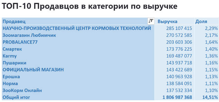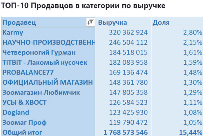 - ТОП-10 Продавцов занимают 15,2% объёма категории по выручке.