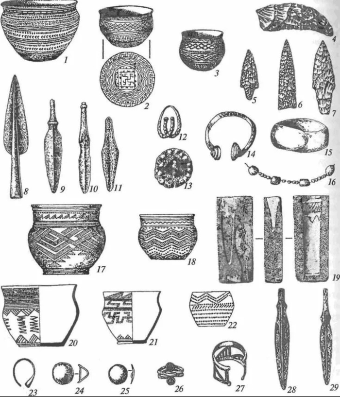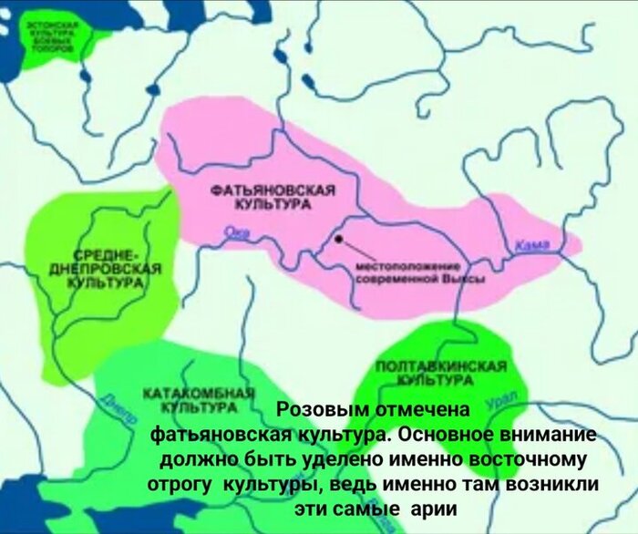 Значит, в самом начале, когда ариями нигде ещё не пахло, из КШКБТ выделились фатьяновцы. Из Восточной Европы они поперли по верхам Волги, в сторону Урала, отгоняя по пути охотников-собирателей на север. Несмотря на то, что места были глухие и по сути таёжные, фатьяновцы были более прогрессивны чем их КШКБТ-братаны оставшиеся на западе.