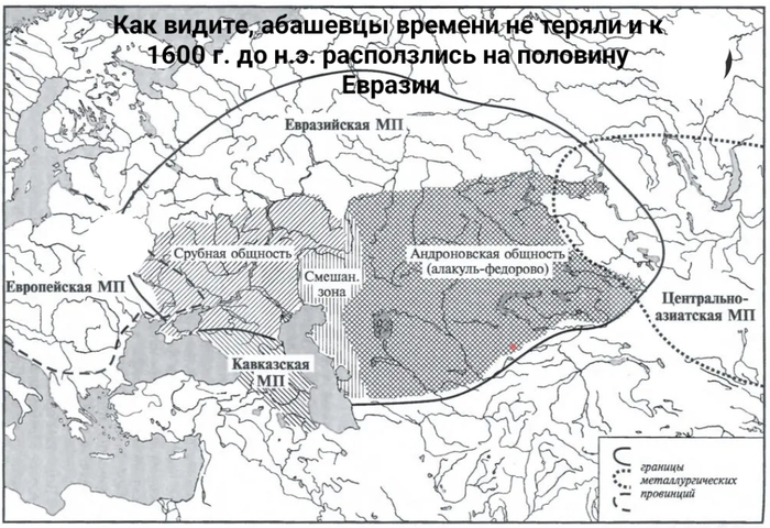 Далее. Балановцы, превратившиеся в абашевцев принимаются РАЗМНОЖАЦЦО. Я это слово выделил не зря. Посмотрите каких размеров достигла небольшая поначалу абашевская культура через несколько сотен лет (в виде срубн. и андрон. культур) умудряясь при этом ещё и непрерывно воевать со всеми вокруг и проводить экспансию от Англии до Китая и Ханаана.