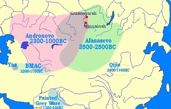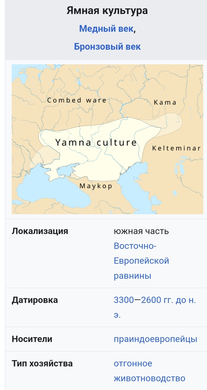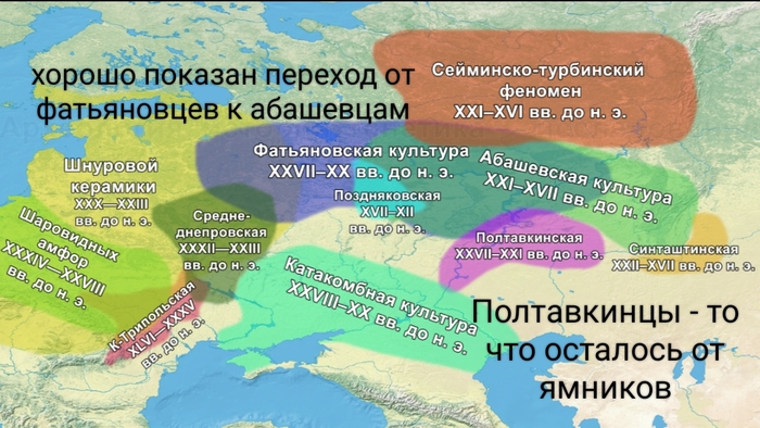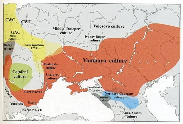 2. Минуя некоторые нюансы типа новоданиловской культуры, переходим сразу к ямной, катакомбной и афанасьевской культурам (3500-2300 года до н.э.) Это уже носители гаплогруппы R1b. То есть сдали ДНК тест и выделились из смешанной генетически Хвалынки))).