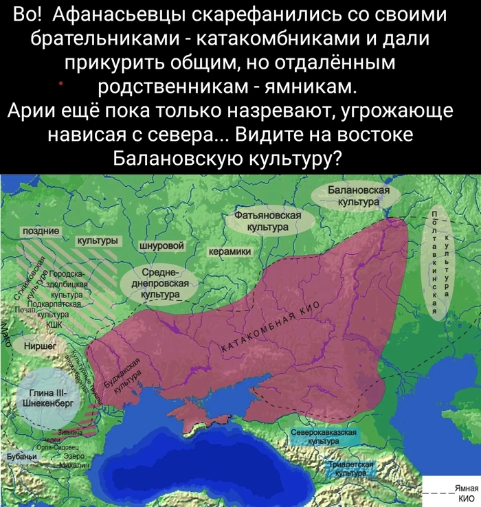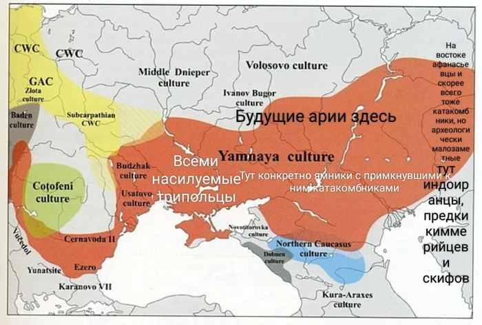 Почему? Потому что с юга у них были великие и ужасные Ямники (от которых позже, в период Синташты остался огрызок в виде полтавкинцев). И через этих ямников к ним каким-то образом попадали женщины (выявлено генетическим анализом) из Трипольской культуры земледельцев (прошу прощения, но их вы должны знать, раз уж дочитали досюда).