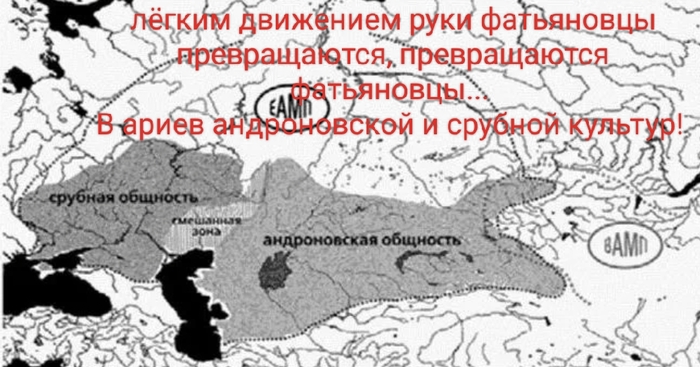 Но, тем не менее, именно восточных фатьяновцев (балановцев) ученые выбрали в качестве своих жертв. Мол внезапно они подверглись влиянию распадающихся и деградирующих ямников/катакомбников.(Те продержались с 3500-ых г. по 2300-ые годы до нэ. и решили вдруг вымереть от "изменений климата"). Балановцам изменения климата оказались нипочём и они, "лёгким движением руки", превращаются в первых ариев - Абашевскую археокультуру. Это грубо 2200 года до нэ. Усекли? То есть проблему наличия славянских балтских и латинских слов в санскрите учёные решили: пришли индоиранцы и овладели балановцами. Язык поменялся на индоиранский, но европейских слов осталось прилично. Правильно это или нет - другой вопрос.