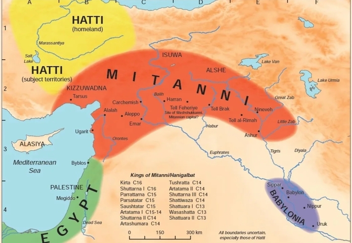 2. Понятно и логично возникновение Митанни (движение именно индоиранских народов на Ближний Восток под давлением с севера пока сами северяне туда проникают в очень малых количествах).