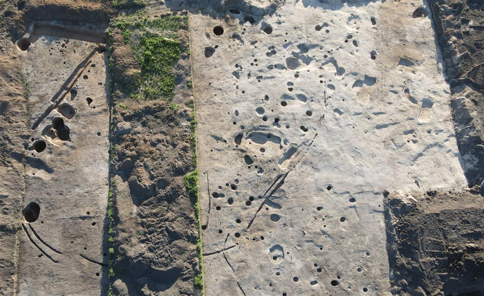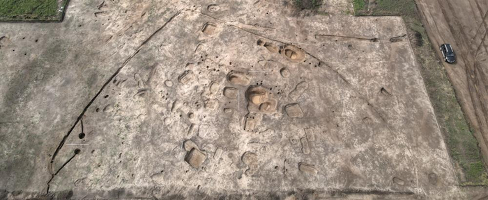 Один из усадебных комплексов. На фото видны котлованы погребов, канавки от ограды и въезд на усадьбу с двумя ямами от столбов ворот по сторонам